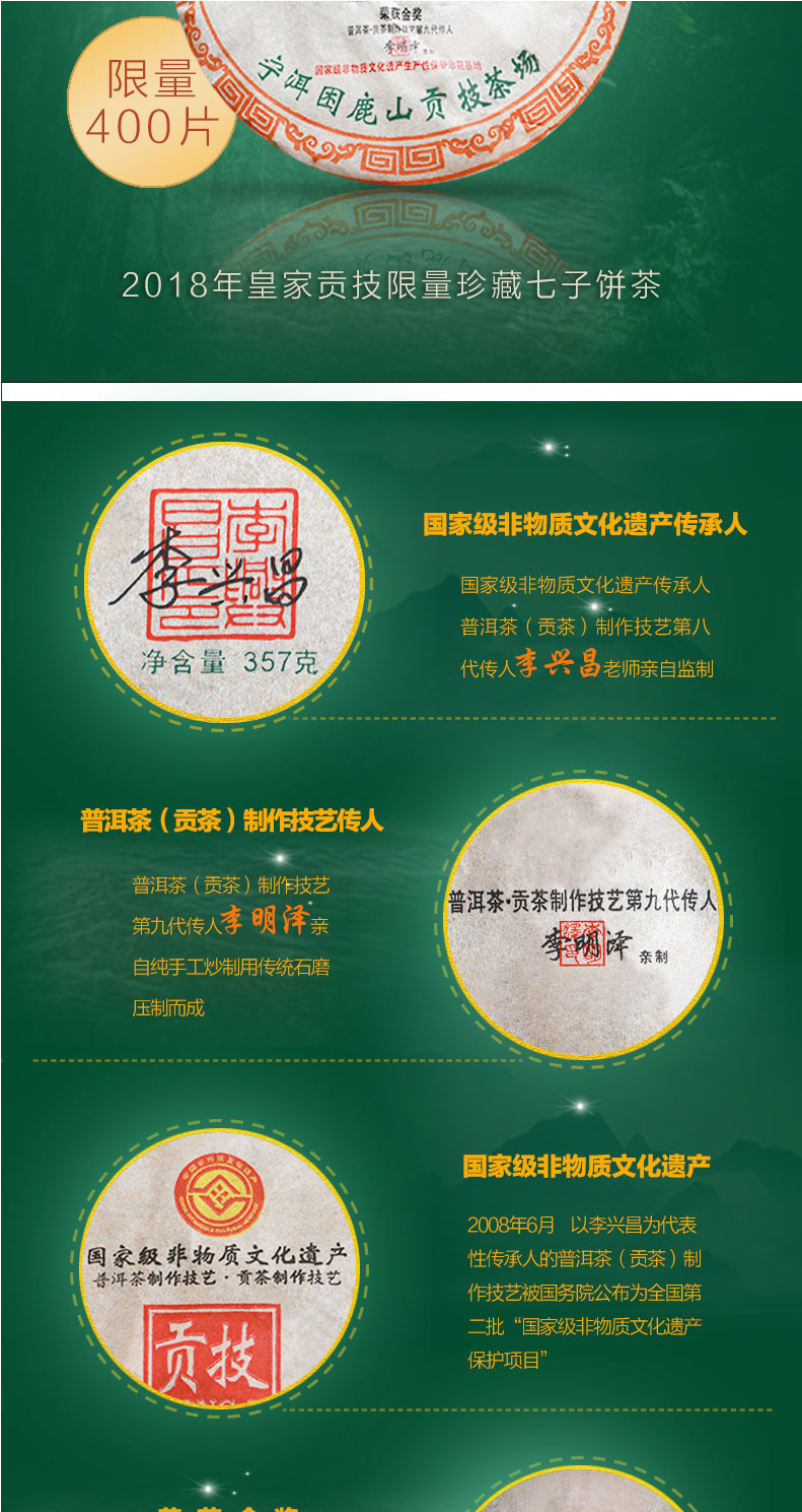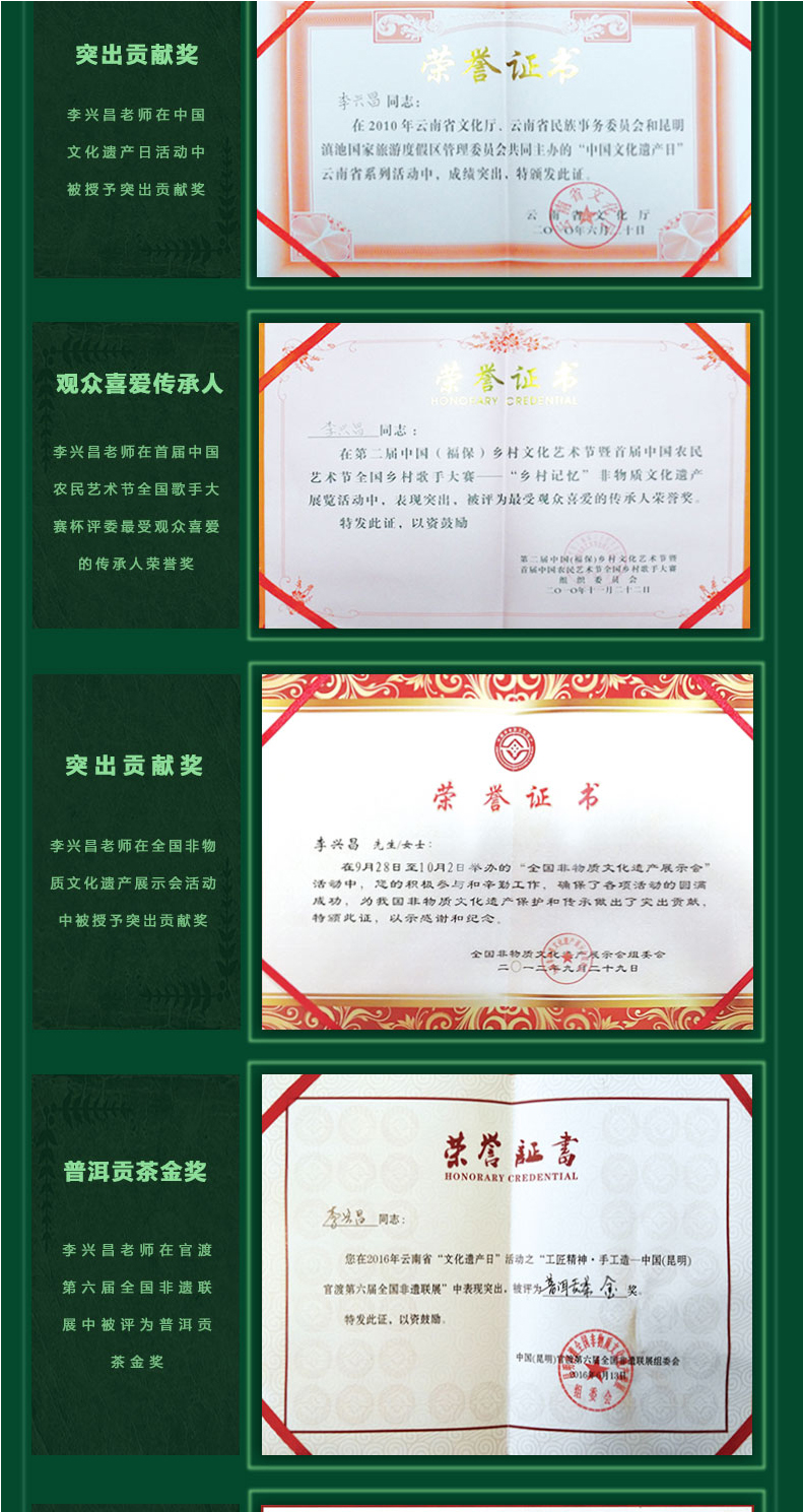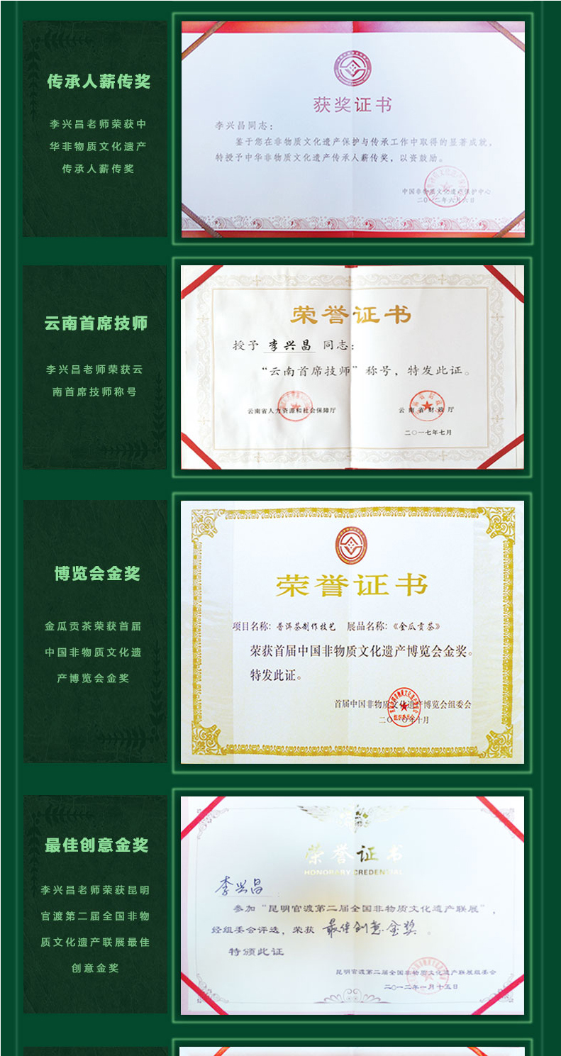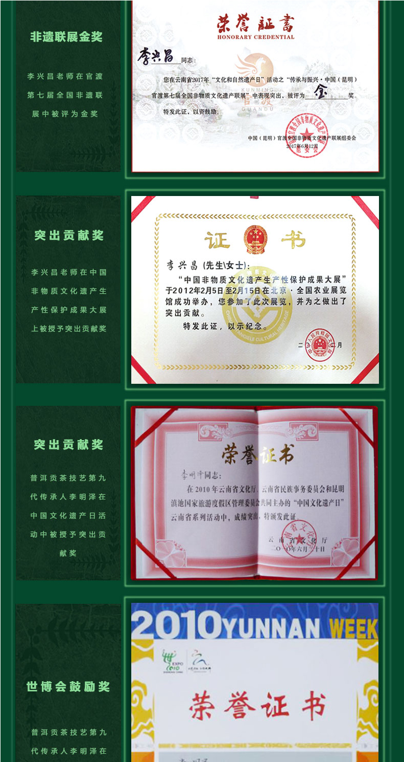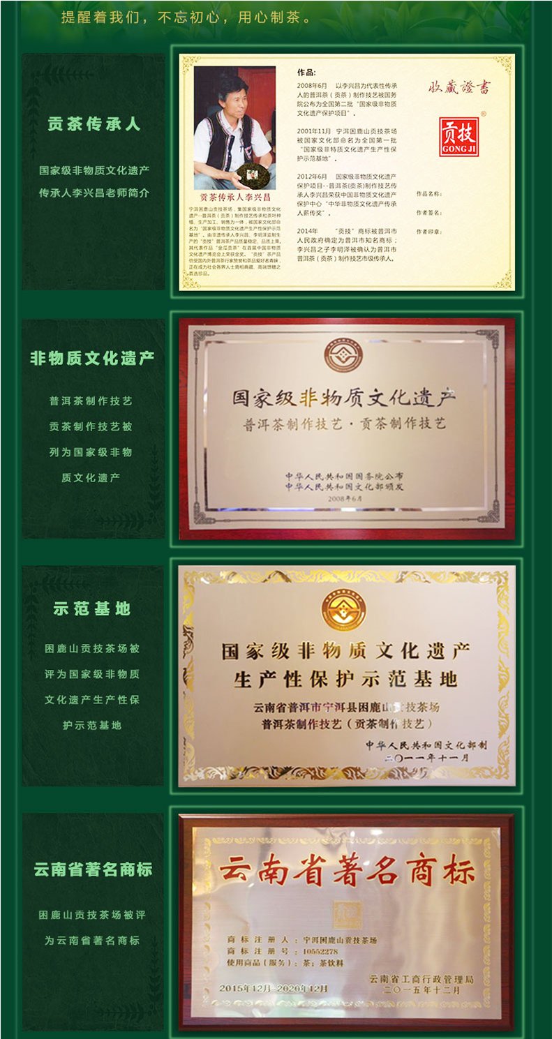 國家級(jí)非物質(zhì)文化遺產(chǎn)保護(hù)名錄 —— 普洱茶制作技藝·貢茶制作技藝。國家級(jí)非物質(zhì)文化遺產(chǎn)生產(chǎn)性保護(hù)示范基地。