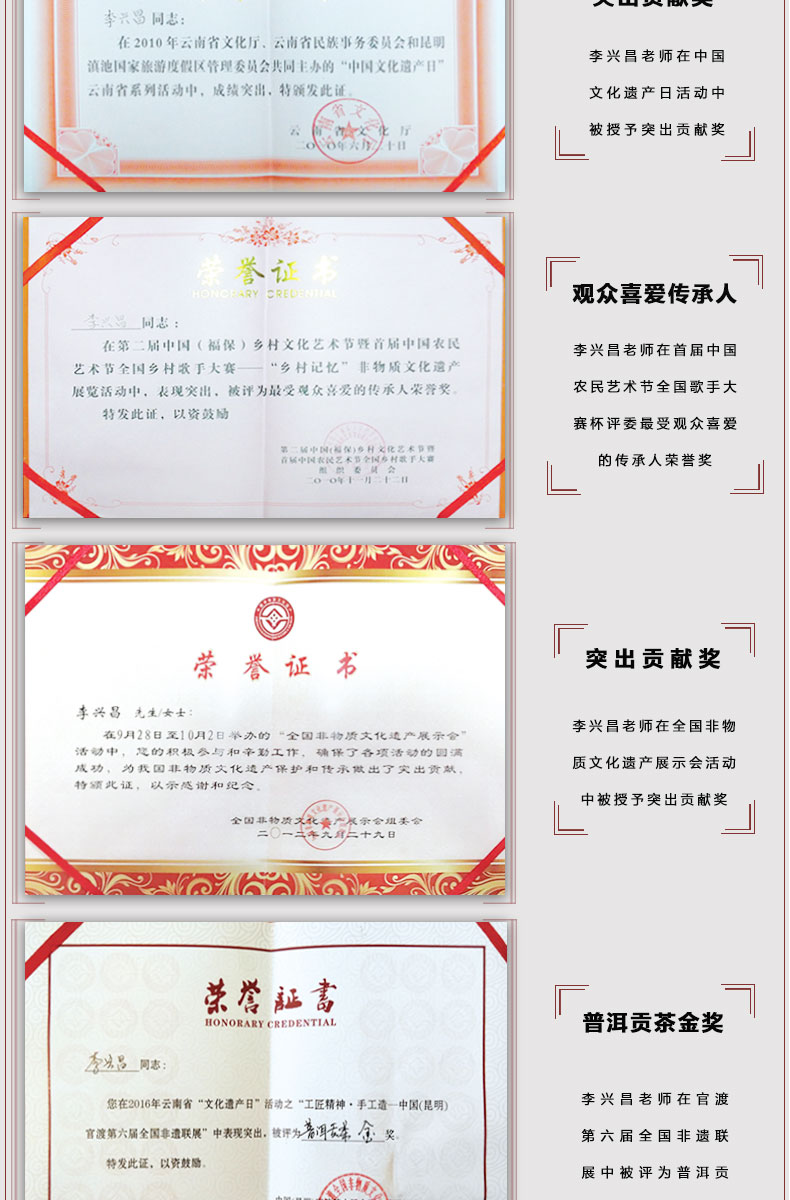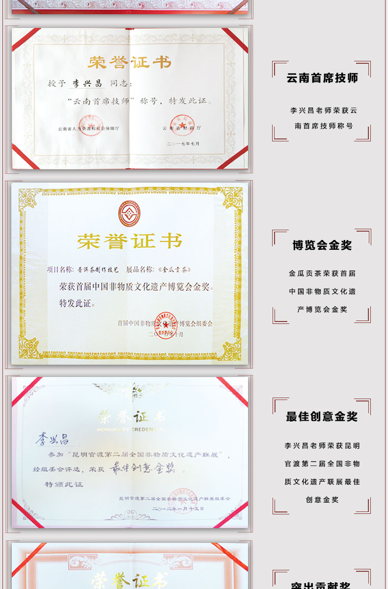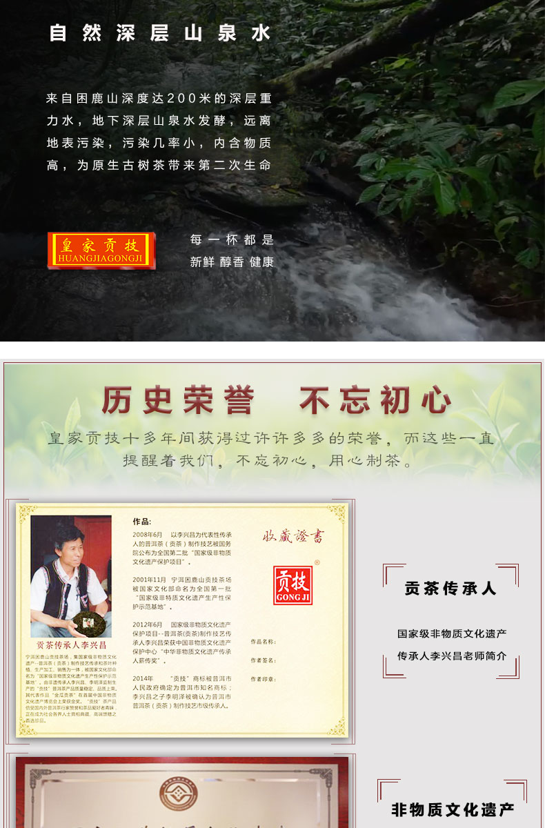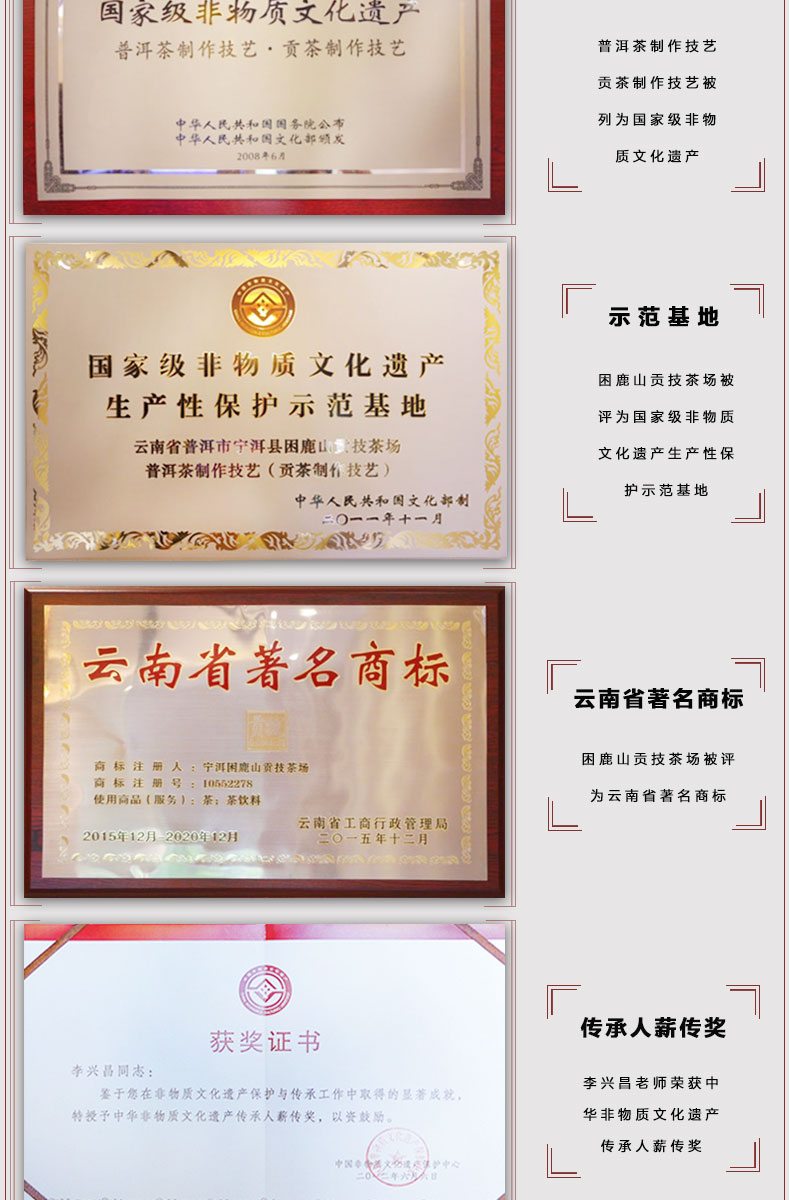 國(guó)家級(jí)非物質(zhì)文化遺產(chǎn)保護(hù)名錄 —— 普洱茶制作技藝·貢茶制作技藝。國(guó)家級(jí)非物質(zhì)文化遺產(chǎn)生產(chǎn)性保護(hù)示范基地。
